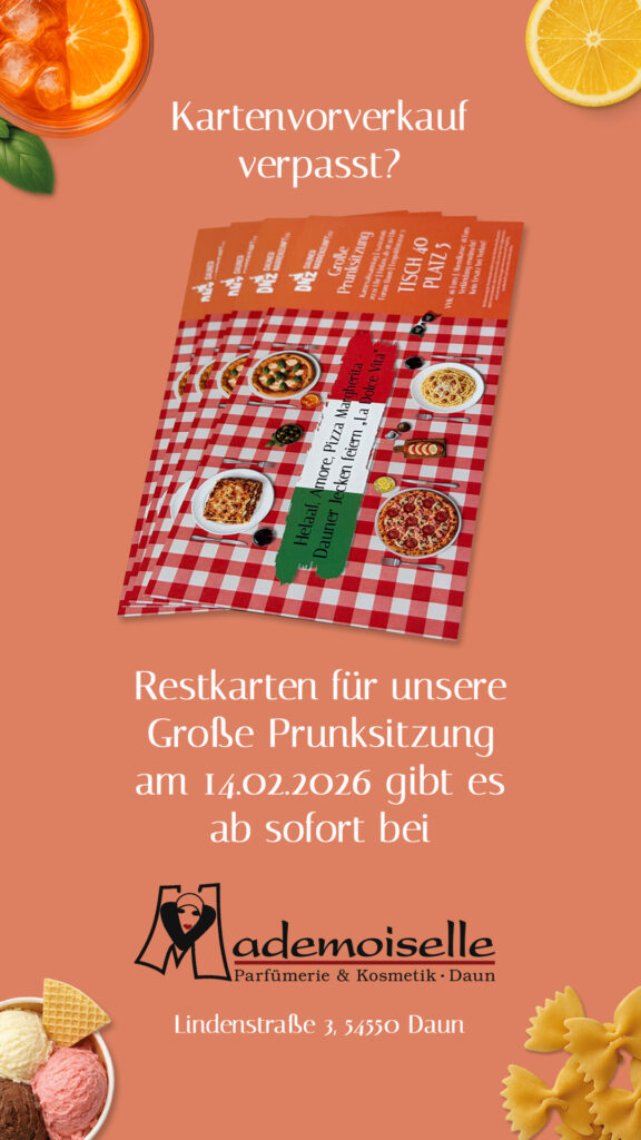 Restkarten für unsere Große Prunksitzung am 14.02.2026 um 20:11 Uhr im Forum Daun gibt es ab sofort bei „Mademoiselle“ in der Lindenstraße 3, 54550 Daun.